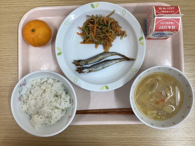 今日の献立・・・ご飯、焼きししゃも、かみかみサラダ、呉汁、冷凍みかん、牛乳