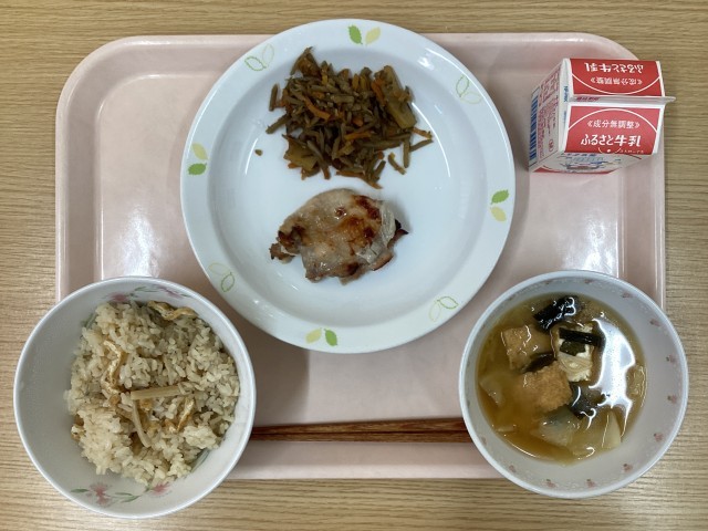 今日の献立・・・新生姜ご飯、鶏肉の塩麹焼き、きんぴらごぼう、キャベツと生揚げの味噌汁、牛乳