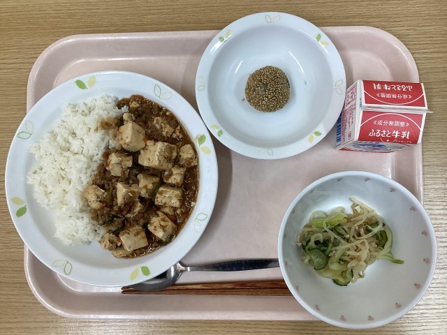 今日の献立・・・麻婆豆腐丼、白菜の中華サラダ、ごま団子、牛乳
