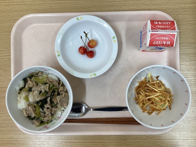 今日の献立・・・豚ばら飯、じゃが芋のハニーサラダ、さくらんぼ、牛乳