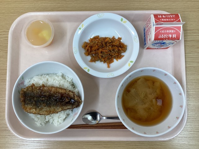今日の献立・・・イワシの蒲焼き丼、にんじんしりしり、具だくさん味噌汁、フルーツゼリー、牛乳
