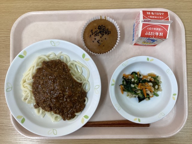今日の献立・・・盛岡じゃじゃ麺、麦入りサラダ、がんづき、牛乳
