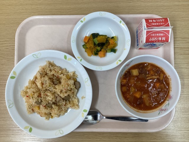 今日の献立・・・ジャンバラヤ、チリコンカン、パンプキンサラダ、牛乳
