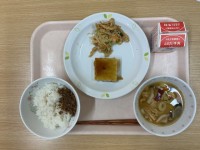 今日の献立・・・ご飯、お魚ふりかけ、擬製豆腐、カリカリ油揚げのサラダ、いなか汁...