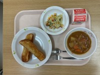 今日の献立・・・ガーリックトースト、ポークシチュー、シーザーサラダ、牛乳 今日...