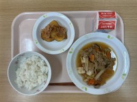 今日の献立・・・ご飯、鯖のおろしがけ、粉吹き芋(カレー味)、けんちん汁、柿、...
