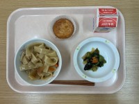 今日の献立・・・おきりこみ、こんにゃくサラダ、りんごケーキ、牛乳 今日は、群馬...