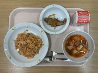 今日の献立・・・チャーハン、珍珠丸子、サンラータン、牛乳 今日の給食は、蒸物料...