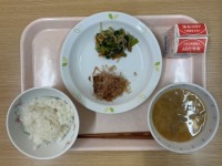 今日の献立・・・豚肉のおろし丼、ゆかり和え、かきたま汁、牛乳 今日の主食は...