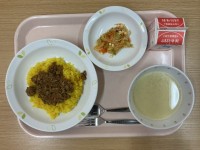 今日の献立・・・ドライカレーライス、イタリアンサラダ、レンズ豆のスープ、牛乳...