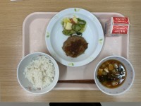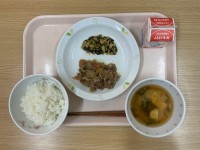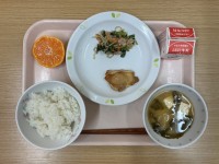 今日の献立・・・ご飯、鶏の照り焼き、胡麻和え、味噌汁、菊花みかん、牛乳 今日の...
