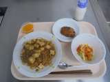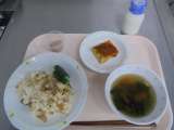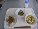 *今日の給食* ・鶏肉のおろし丼 ・小松菜と卵の炒め物 ・玉ねぎのみそ汁 ・...