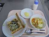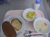 *今日の給食* ・ねぎピザトースト ・ベーコンと野菜のスープ煮 ・ごまのプリ...