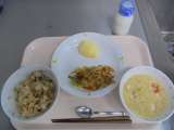 *今日の給食* ・ごはん ・たらのヤンニョムかけ ・チャプチェ ・ふんわり団...
