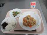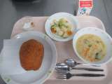 *今日の給食* ・ねぎ塩豚丼 ・沢煮椀 ・お菓子な焼きいも ・牛乳 3年1...