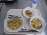 *今日の給食* ・ねぎ塩豚丼 ・山吹あえ ・けんちん汁 ・牛乳 〜組別給食・...