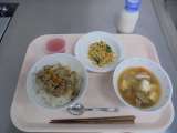 *今日の給食* ・ごはん ・揚げ出し豆腐肉みそかけ ・和風サラダ ・小松菜の...