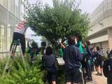 技家部と科学部が校内の梅の木になった梅を収穫しています。梅の木がどこに生えている...