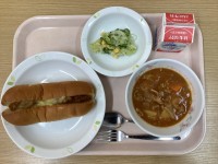 今日の献立・・・チリビーンズドッグ、トマトシチュー、コーン入りフレンチサラダ、牛...