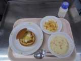 *今日の給食* ・バニーチャウ ・お米のポタージュ ・フライドポテトサラダ ・...