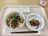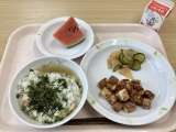 ** 今日の給食 ** 鮭茶漬け 高野豆腐の唐揚げ シャキシャキ野菜 果物(す...