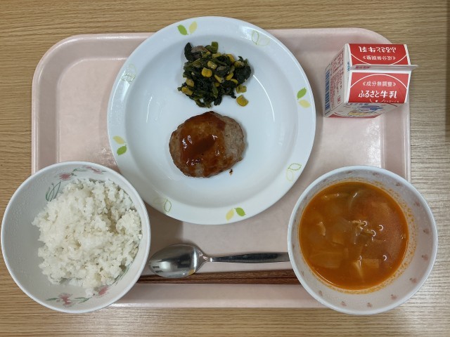 今日の献立・・・ご飯、ハンバーグ、ほうれん草とコーンのソテー、ミネストローネ...