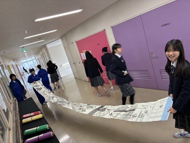 美術の時間に、一人一人が筆を用いて描いた妖怪たちが、各クラスで一本の絵巻物になりました^_^
