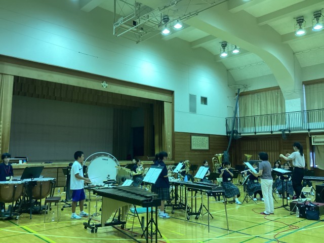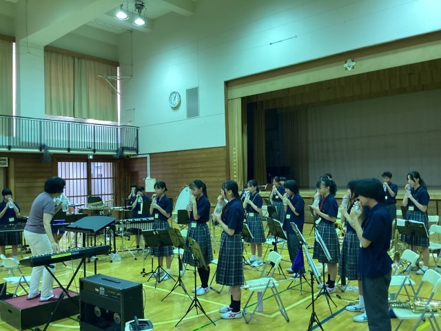 連日練習に励んでおりますが、昨日の午後は体育館をお借りし、コンクール本番のセッティングで練習をさせていただきました。部員数が今年は増え全26名、体育館の舞台にはおさまりません。楽器を全員が構えて並んだ姿は、とても迫力があります。