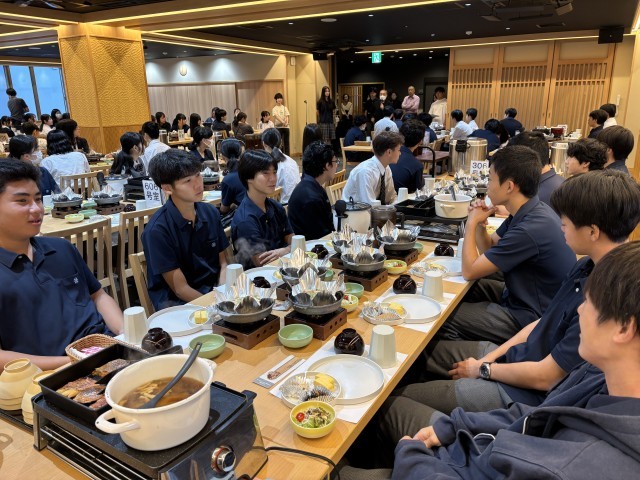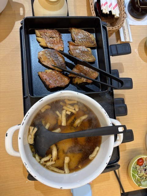 昨夜のすき焼き、1人平均299gの肉を食べ、しおりをいただきました。朝は和食です。
