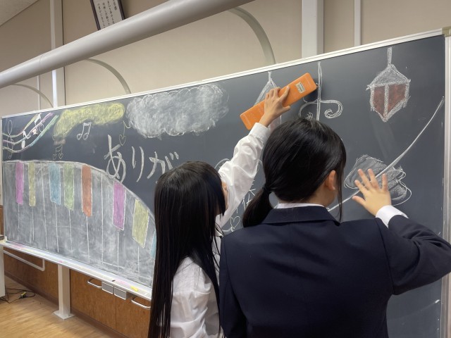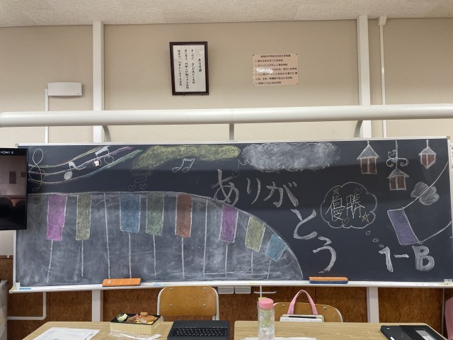 当日に書いてくれた黒板アートを眺めながら、学発当日や本番までの練習期間のことを思い出して、作文を書いていました!