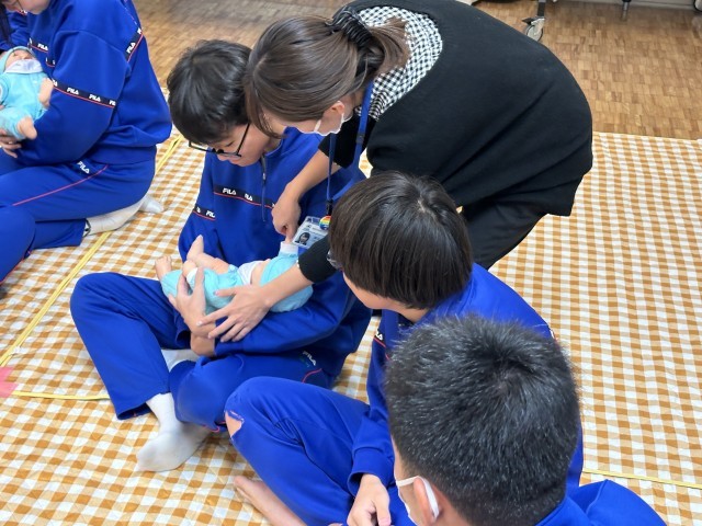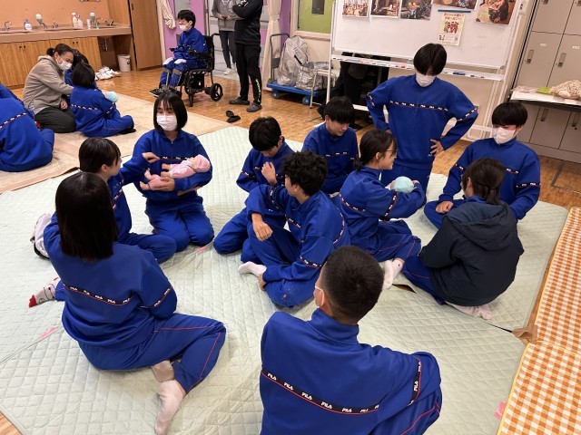 3年生が家庭科の学習で乳幼児ふれあい体験を行いました。実際にふれあう中で、子どものかわいらしさや命の大切さを感じることができたようです。