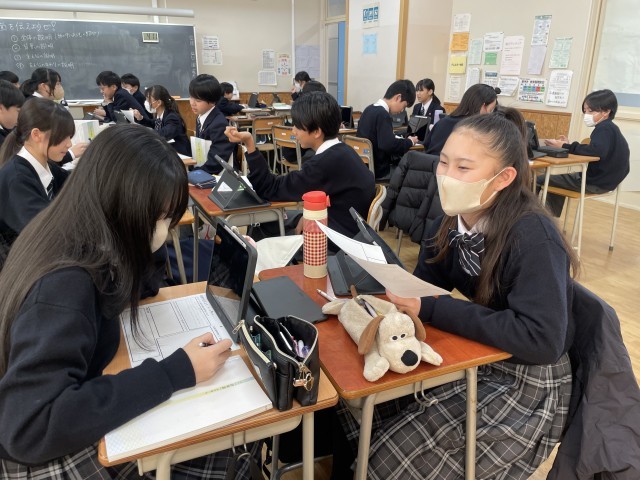日本語の授業では、「場面を伝えよう」を行いました。ペアでそれぞれ異なるイラストについて説明文を書き、その後、ペアの人の説明文をききながら絵を描きました。実際のイラストと、友達が書いた絵を見比べて、大盛り上がり!!!