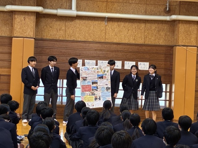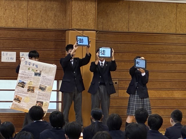 今回は学級委員からの各クラスへの反省の他に、校外学習事後学習の発表や百人一首大会チーム賞の表彰も行いました。