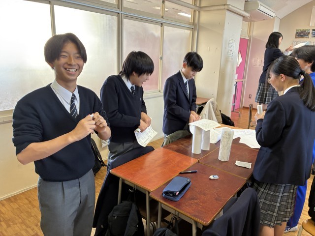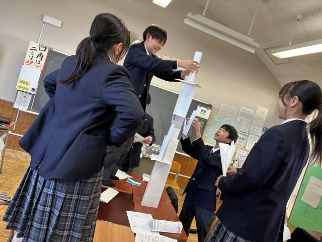 どの班が、一番工夫して紙を高く重ねられるか!?