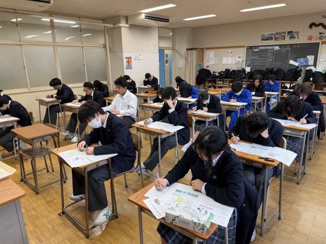 3年生にとって中学校最後となる学年末試験の1日目です。中学校生活の締めくくりとして、最後まで粘り強く取り組んでほしいと思います。