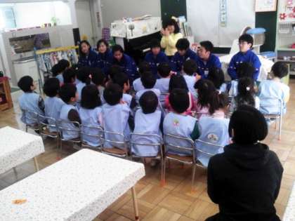 1月の第2週から3週にかけて、二年生の保育実習を、家庭科授業の一環として実施しています。近隣の幼稚園に伺い、園児たちと楽しく過ごさせていただいています。