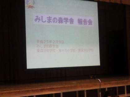 「みしまの森学舎」授業公開の後、今年度の保護者報告会を開催しました。等々力小学校三年生、東深沢小学校四年生、本校1年A組の児童・生徒による合唱のオープニングから始まりました。また、分科会の中の児童・生徒会については、三人の代表生徒によるプレゼンでした。そほか、三部会(知育・徳育・体育食育)からの発表など、様々な取組について報告しました。