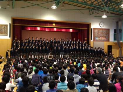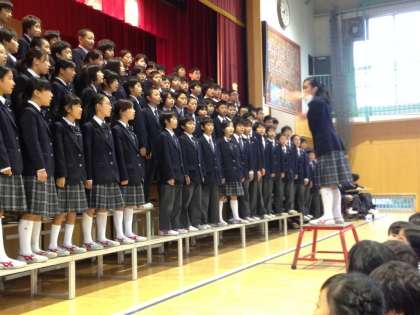 あいにくの雨でしたが、一年生の歌声が雨雲を吹き払うようでした。成長した姿に小学生もじっと聞き入っていました。
