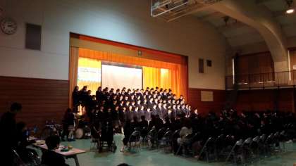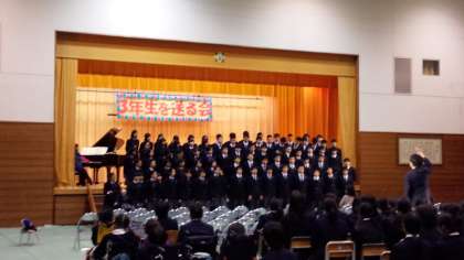 3月7日(金)に3年生を送る会を行いました。在校生による合唱や生徒会のメッセージDVDや3年生が技術の授業で作成したフォトムービーの上映などとても心こもった会となりました。また、先生たちによる手品、ダンス、合唱も生徒たちにとても好評でした。