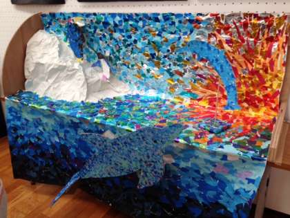 自分の思いを綴った詩を、筆を使って力強く表現した書写の作品。海の美しさを表現した貼り絵の合同作品。どちらもI組のパワーを感じることができました。