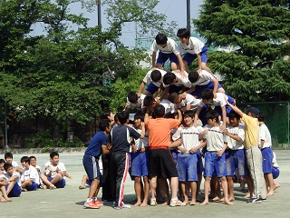 6月6日の行われる体育祭に向けて、練習、練習の日々。写真は放課後練習の一コマです。ジャージ、体育着はどろと汗。ダンスも組体操も熱をおび、気合いが入っています。