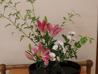 生け花は本校華道部外部指導員の先生によるもの。玄関に秋の気配をただよわせています。