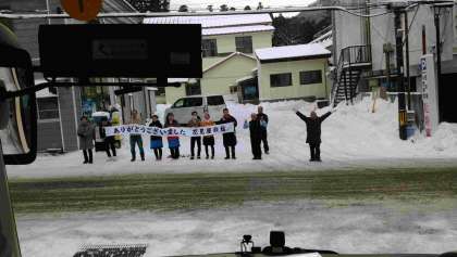 三日目は風もあまりなく絶好のスキー日和でした。宿での出発前準備もスムーズに進み全体集合写真を撮影して、講習がスタートしました。短い時間ではありましたが、三日間の成長を感じられる講習となりました。最後は「もっと滑りたい」というたくさんの声も聞き、心に残る貴重な体験になりました。昼食は花見屋さん恒例のカレーライスをいただき、帰路につきます。予定通り13時に出発して、到着予定は18時頃となります。
