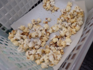 2年生が技術科で栽培したとうもろこし。フライパンでいって、ポップコーンにしました。塩味、コンソメ味、キャラメル味、チョコレート味とバラエティ豊かにできあがりました。味のつき具合にばらつきがあるのはご愛敬。食べ始めると止まらない。給食ちゃんと食べられたかな?