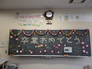 写真は本校特別支援学級(I組)の黒板。みんなで作った時計も卒業生を見送ってくれました。