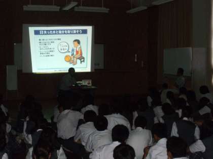 熱中症の詳しい症状やその対処法、また体内の水分の出入りなど、ためになるお話しがたくさんありました。子どもたちは真剣に話を聞くことができ、夏休み中の部活などにも活かそうとする姿勢が見られました。
