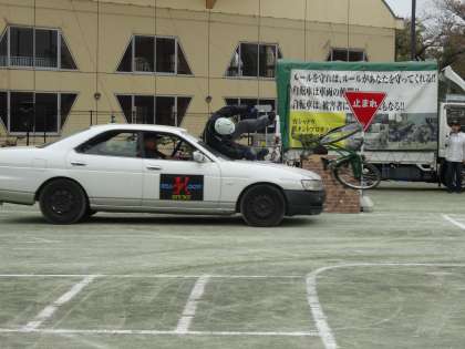 4月17日(月)5校時、校庭で自転車交通教室を実施しました。実際に起こった自転車事故を、スタントマンの方々が体を張って実演してくださいました。生徒たちは、「もし自分だったら」と想像しながら見入っていました。