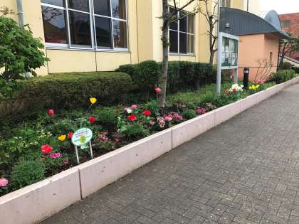 昨年度、東京都公園協会の助成を受け、生徒と地域の団体、東深沢・等々力コミュニティーの皆さんが協力して植えたチューリップが満開です。花ある暮らしは、心が和んでいいですね。今年度も花ボランティアを頑張ります