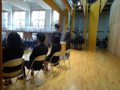 4月28日(金)6時間目、離任式が行われました。転出された4名の先生が出席されました。どの先生方も東深沢中学校は居心地の良い学校だと口をそろえてお話しされていました。離任された先生方にとっての最後の校歌。生徒たちの歌声を聞いて、安心していました。