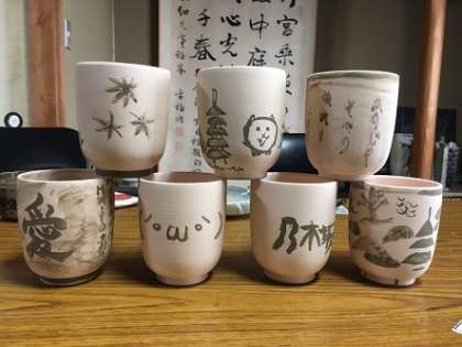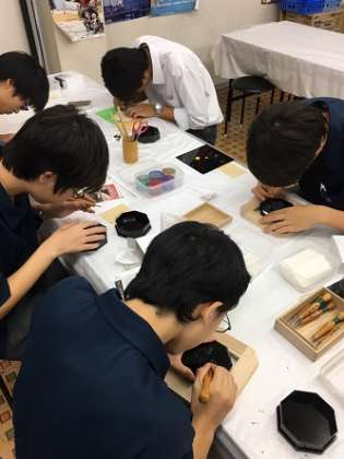 午前中の体験活動。扇の絵付けをしたり、花瓶を作ったり、各班充実した時間を送っています。写真は清水焼と漆器の絵付けです。